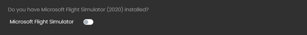 Page 5 will ask you if you have FS2020 installed and would like to use STKP with it. If you use MSFS, set the switch to on, if not, click the blue 'Next' button and proceed to the section for Page 6.