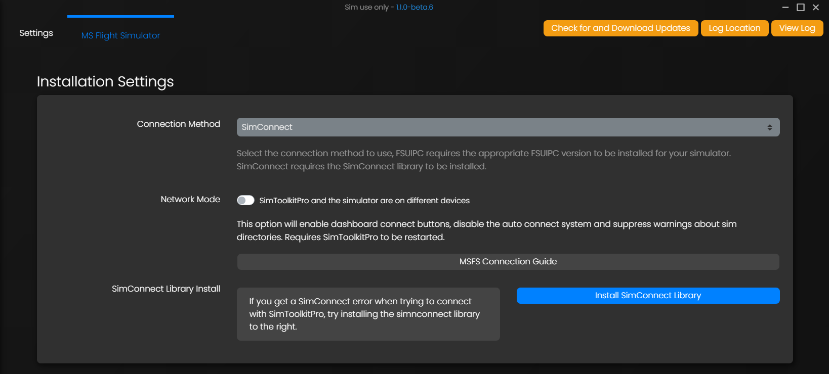 In this tab ensure that 'SimConnect' is selected as the Connection Method and click the 'Install SimConnect Library' button to install the connector applet. Before doing this, ensure that the simulator is not running and you have the rights to install programs on the computer. You may need to run SimToolkitPro as administrator to do this. During the installation, a small white box should pop up and depending on the capabilities of your computer, disappear relatively quickly. This is normal behavior.