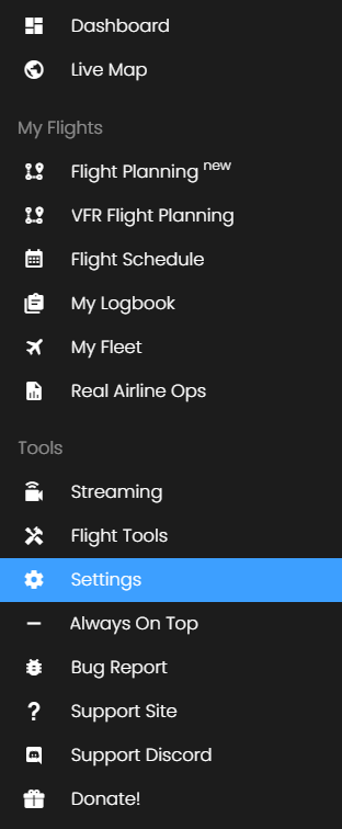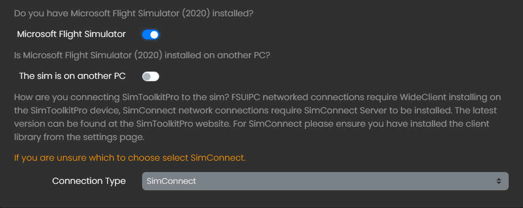 This is a dropdown menu that will let you choose what to use to connect to your simulator. The options are either SimConnect or FSUIPC. If you have any doubt about which to choose, select SimConnect.