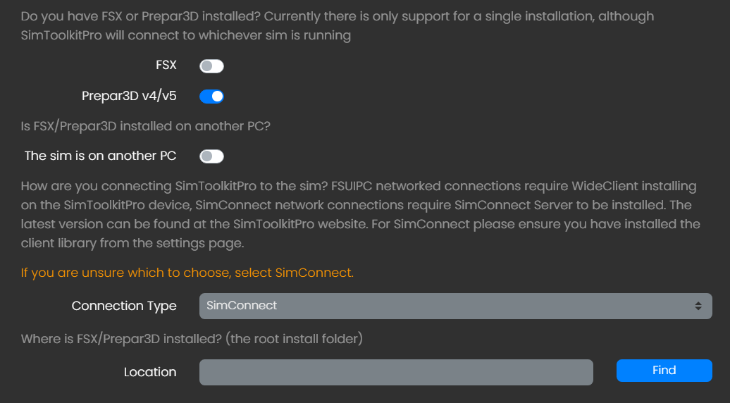 For a local setup, you have to tell STKP where Prepar3D/FSX is installed. Click the blue 'Find' button and browse to the root of your sim installation (where the Prepar3D.exe or FSX.exe file is). When you're there, click the 'Select Folder' button at the bottom right corner of the File Explorer window. This will send the path back to STKP and populate the box. Ensure that the location is correct. In the case that it isn't, use the 'Find' button again and select the correct path.