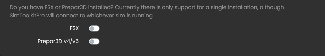 Page 4 will ask you if you have FSX or Prepar3D installed and would like to use STKP with them. If you use either, set the appropriate switch to on, if not, click the blue 'Next' button and proceed to the section for Page 5.