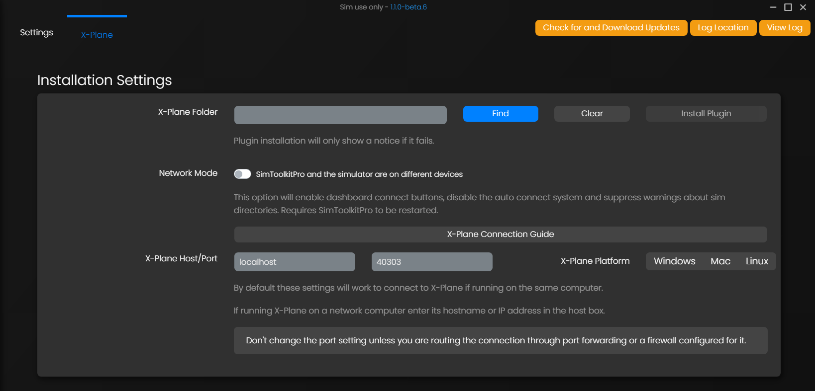 In this tab ensure that the 'X-Plane Folder' box is populated. As covered before, this should be set to the location of the X-Plane.exe file. With the folder selected, click the 'Install Plugin' button to copy over the required files. In the event of an error, notices will appear in the top right of the app. Errors are likely to be permissions based, so ensure that the simulator is not running and you have the required rights to place plugins in the folder. You may need to run SimToolkitPro as administrator to do this.